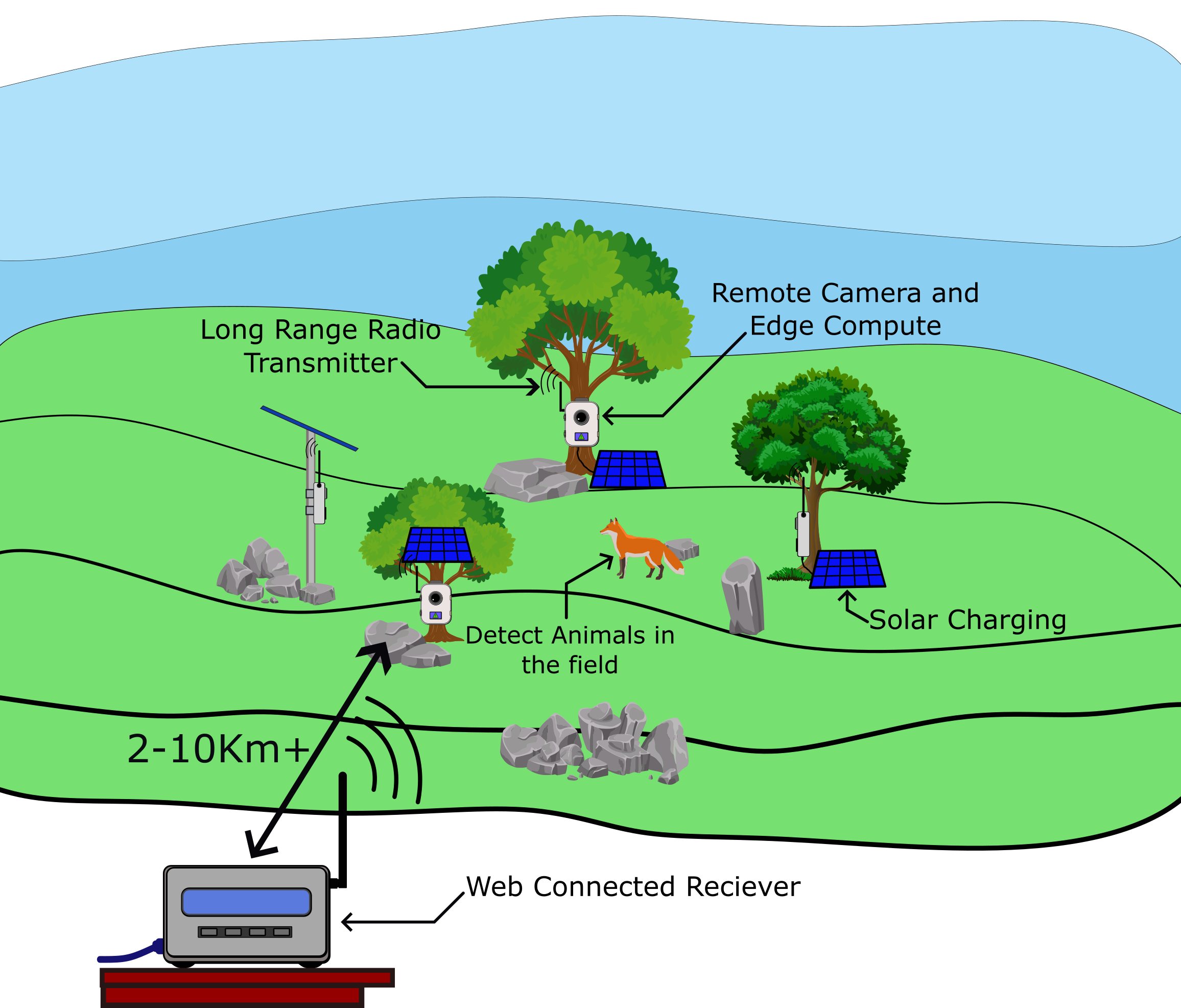 By processing the raw image data with advanced AI models at the point of collection, we can utilize low bandwidth, long-range radio, transmission to transmit the extracted detection data to a central location. This allows us to detect in remote locations without streaming high-bandwidth image data to cloud servers. A distant receiver can be used to enable cloud connectivity for data logging and real-time data sharing from anywhere in the world.